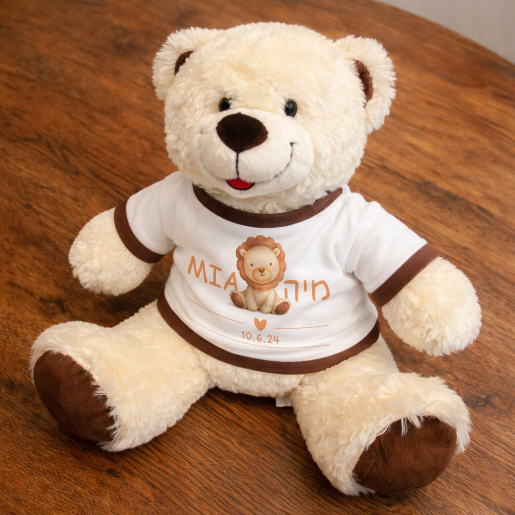 דובי ענק, עם חיוך מתוק ועיצוב מודפס של תעודת לידה על החולצה שלו:)